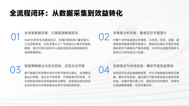 MyEMS实现了从数据采集到效益转化的全流程闭环,显著提升能源管理水平。全场景数据采集通过支持主流通信协议,无缝对接各类设备与系统,实时采集能耗数据,经可视化监控中心直观呈现,打破能源数据孤岛,为后续分析提供坚实基础。