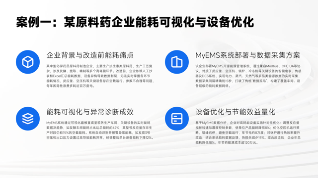 前面我们详细了解了MyEMS系统在化学药品原料药行业的全场景数据采集、多维度分析诊断、智能策略输出与优化控制以及效果验证与持续改进等方面的功能。接下来,让我们通过具体的实施案例,深入看看该系统在实际应用中带来的效益,感受其节能的显著成效。