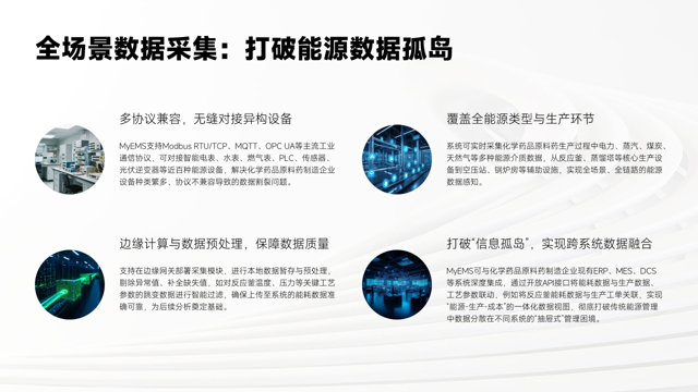 该系统能覆盖全能源类型与生产环节,实时采集电力、蒸汽等多种能源介质数据,从核心生产设备到辅助设施都能实现全链路的能源数据感知。