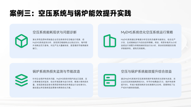 最终,该企业空压系统能耗降低15%,年节约电费超8万元;锅炉热效率提升8%,年减少能源消耗折合标准煤约200吨,生产成本与碳排放强度显著降低。