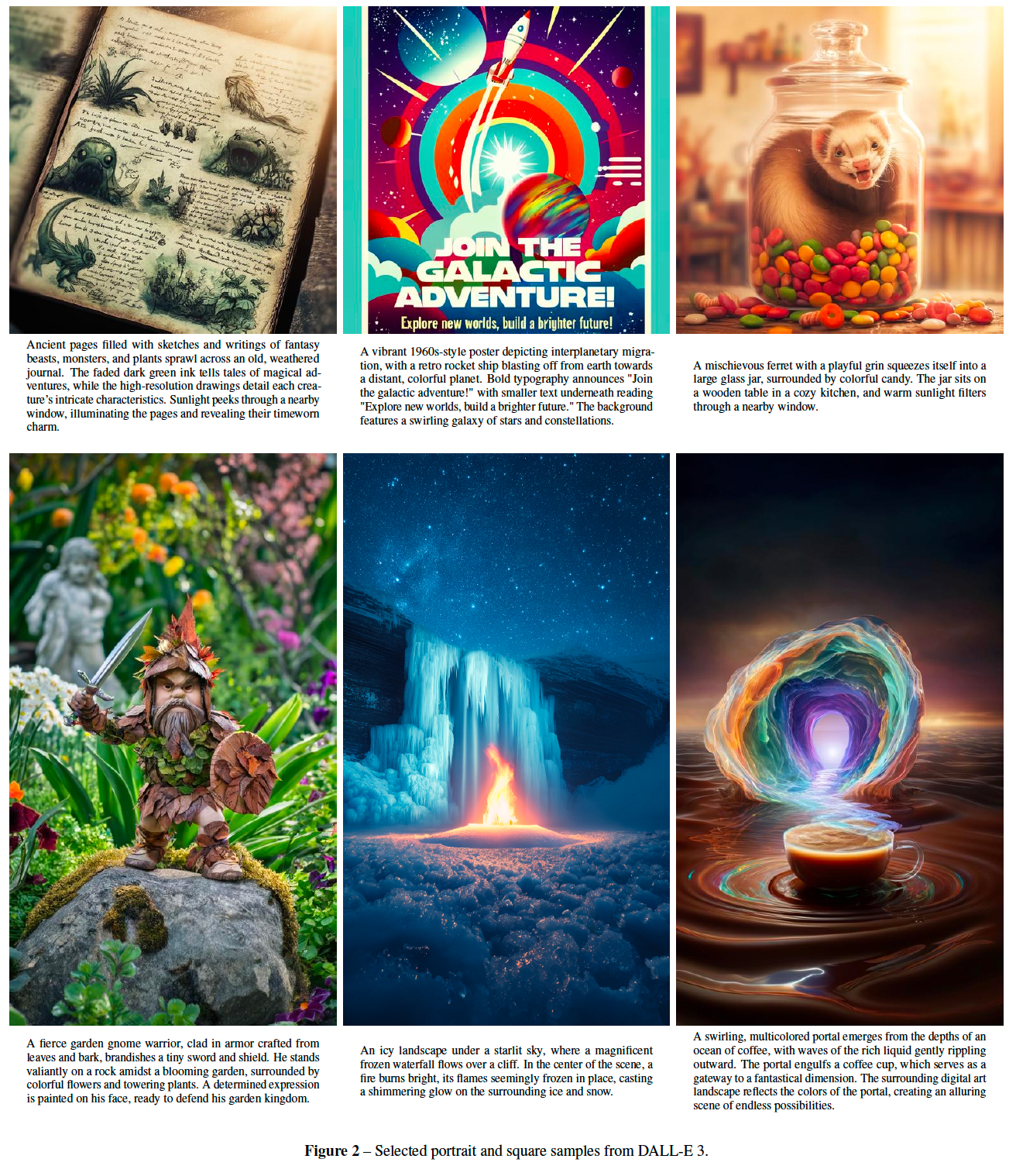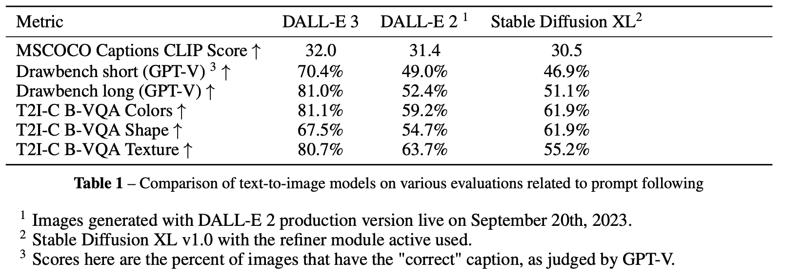 5 ^{5} 5 DALL-E 3相比DALL-E 2有许多改进,其中许多在本文中未涵盖,由于时间和计算原因无法进行消融研究。本文讨论的评估指标不应被解释为仅仅通过在合成描述文本上训练所产生的性能比较。