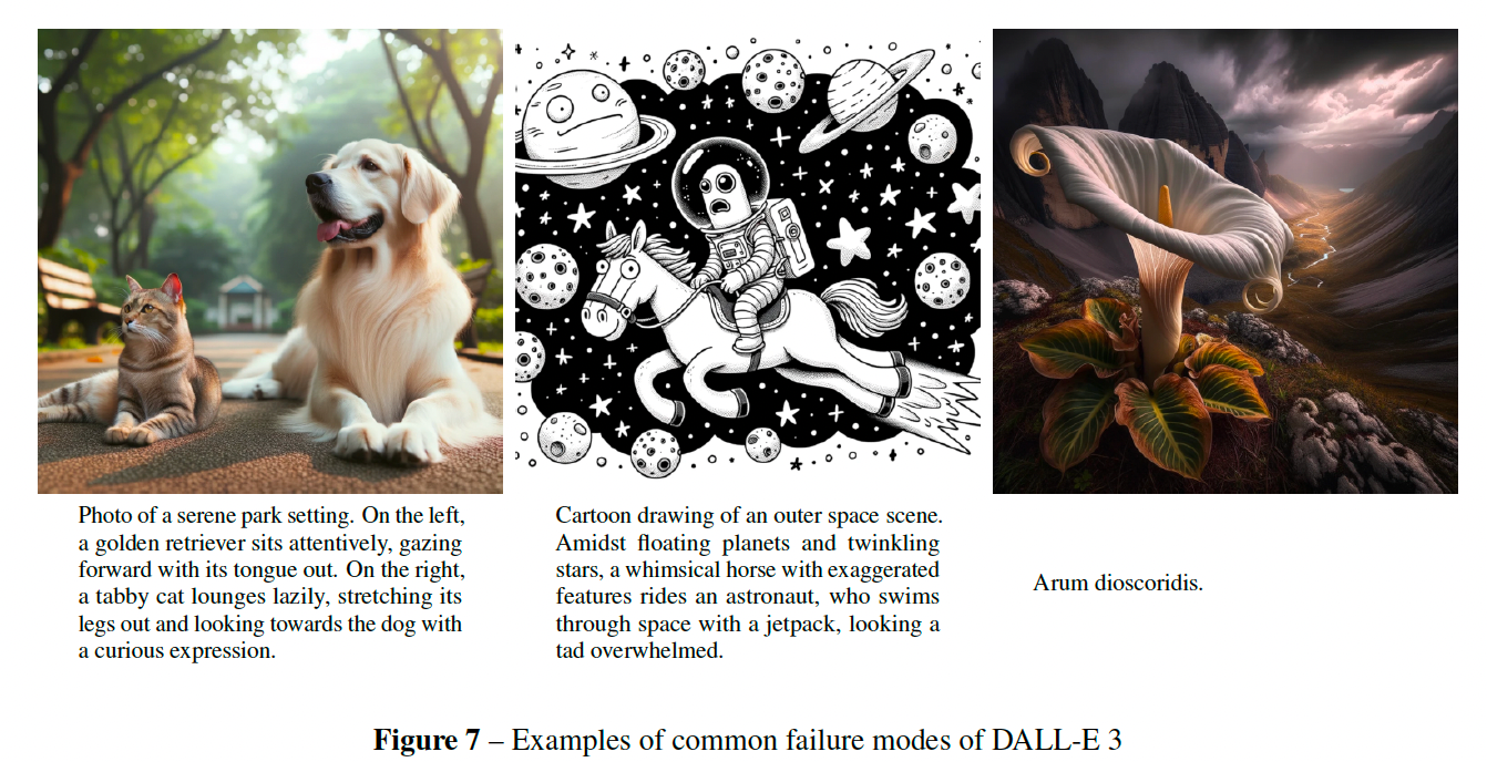 这对我们的文本到图像模型有下游影响:DALL-E 3在生成上述特定术语的图像方面不可靠。我们相信,对描述生成器的进一步改进应该能够使我们的文本到图像模型进一步改进。