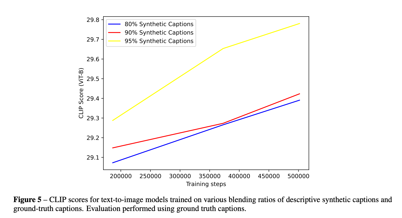 克服这个问题的最佳方法是将我们的输入正则化到更接近人类可能使用的风格和格式的文本分布。当使用真实描述文本时,你可以"免费"获得这一点,因为这些描述文本实际上是从人类编写的文本分布中提取的。为了在使用合成描述文本时将这种正则化引入我们的模型训练,我们选择将合成描述文本与真实描述文本混合。