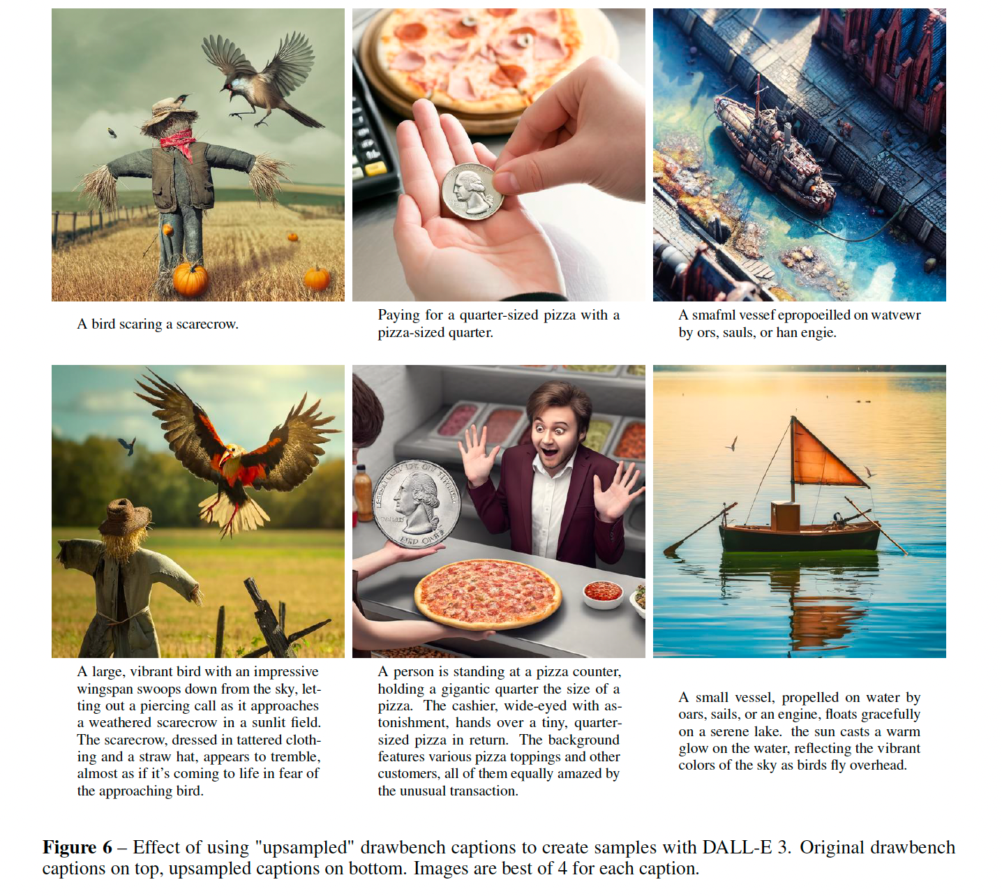 实际上,给定一个提示,例如附录C中找到的提示,我们发现GPT-4将 readily"上采样"任何描述文本为高度描述性的描述文本。为了演示这种方法可能如何有用,我们在来自drawbench数据集[24]的描述文本上执行此过程,并在表7中可视化结果。