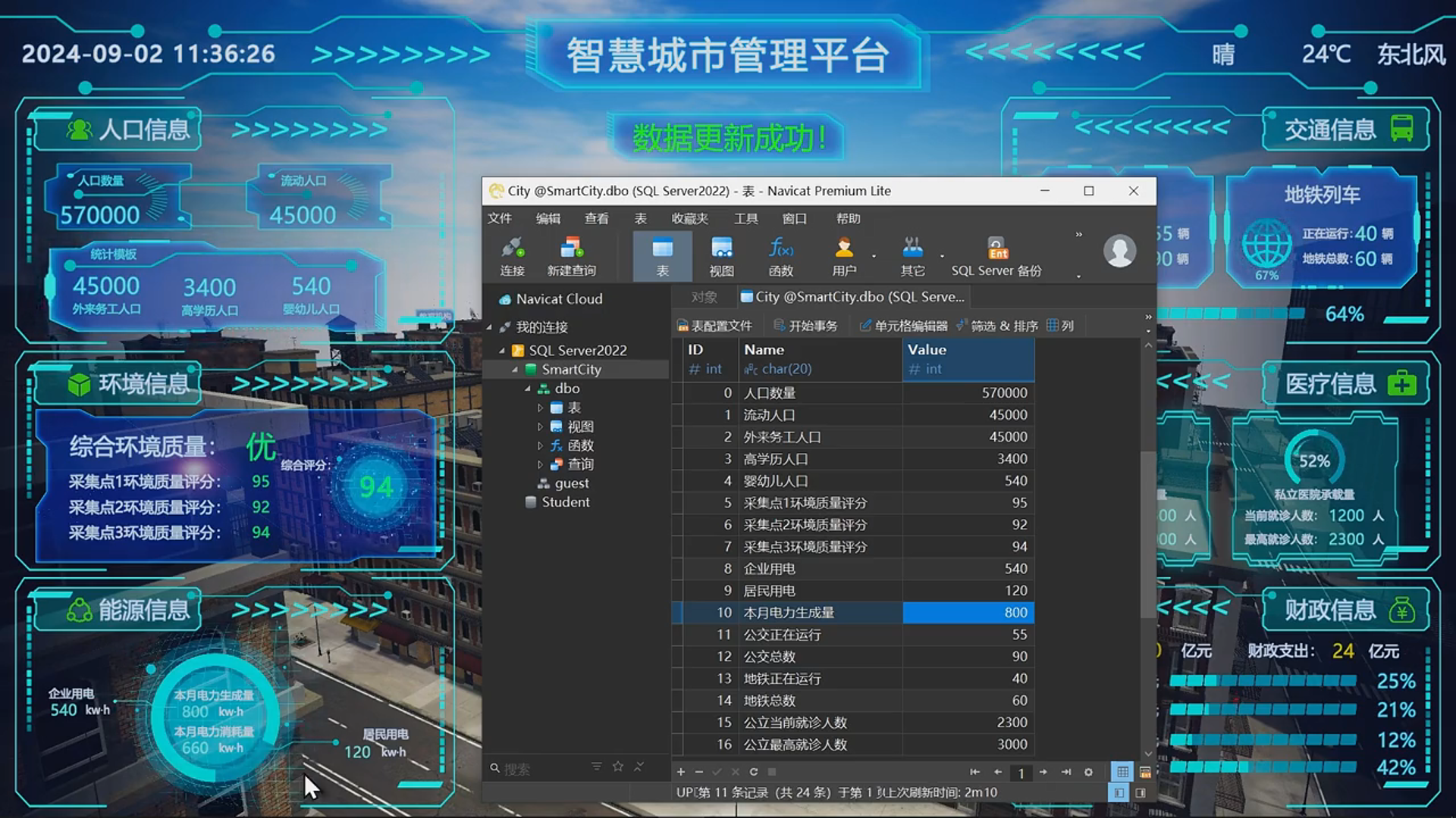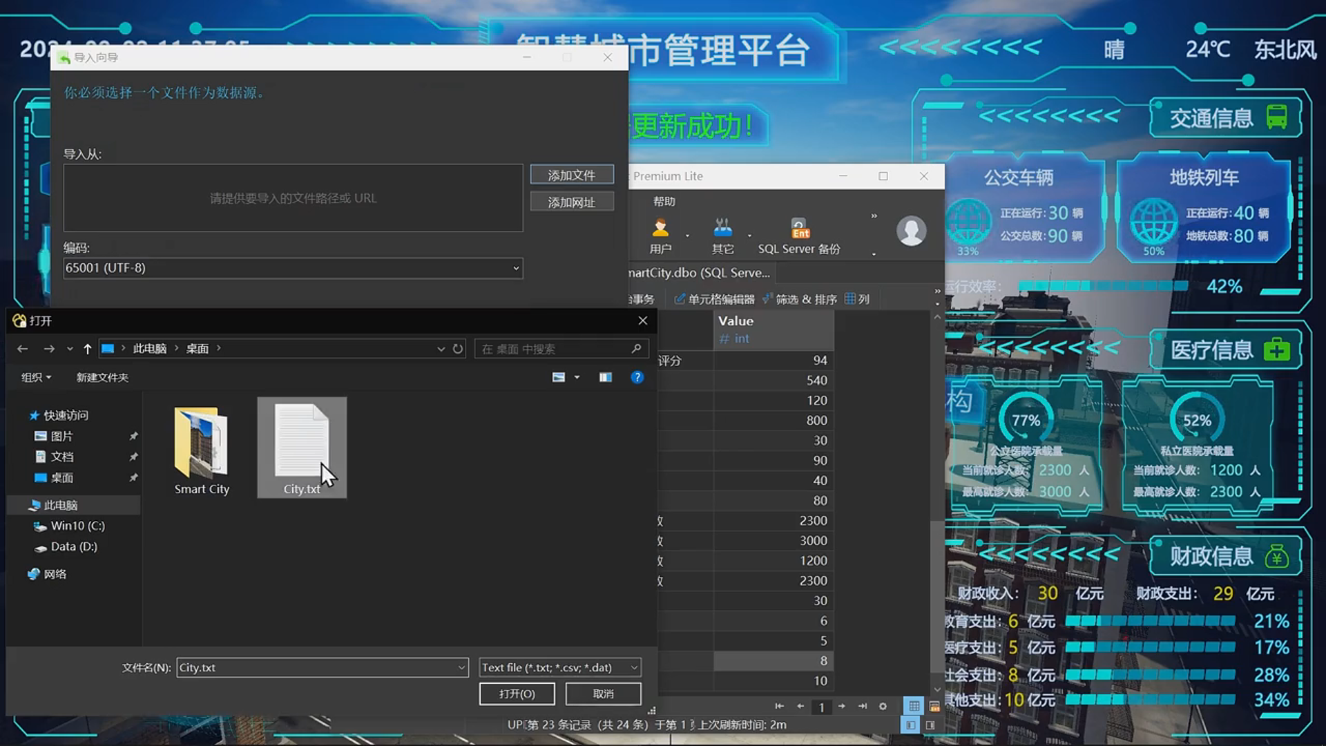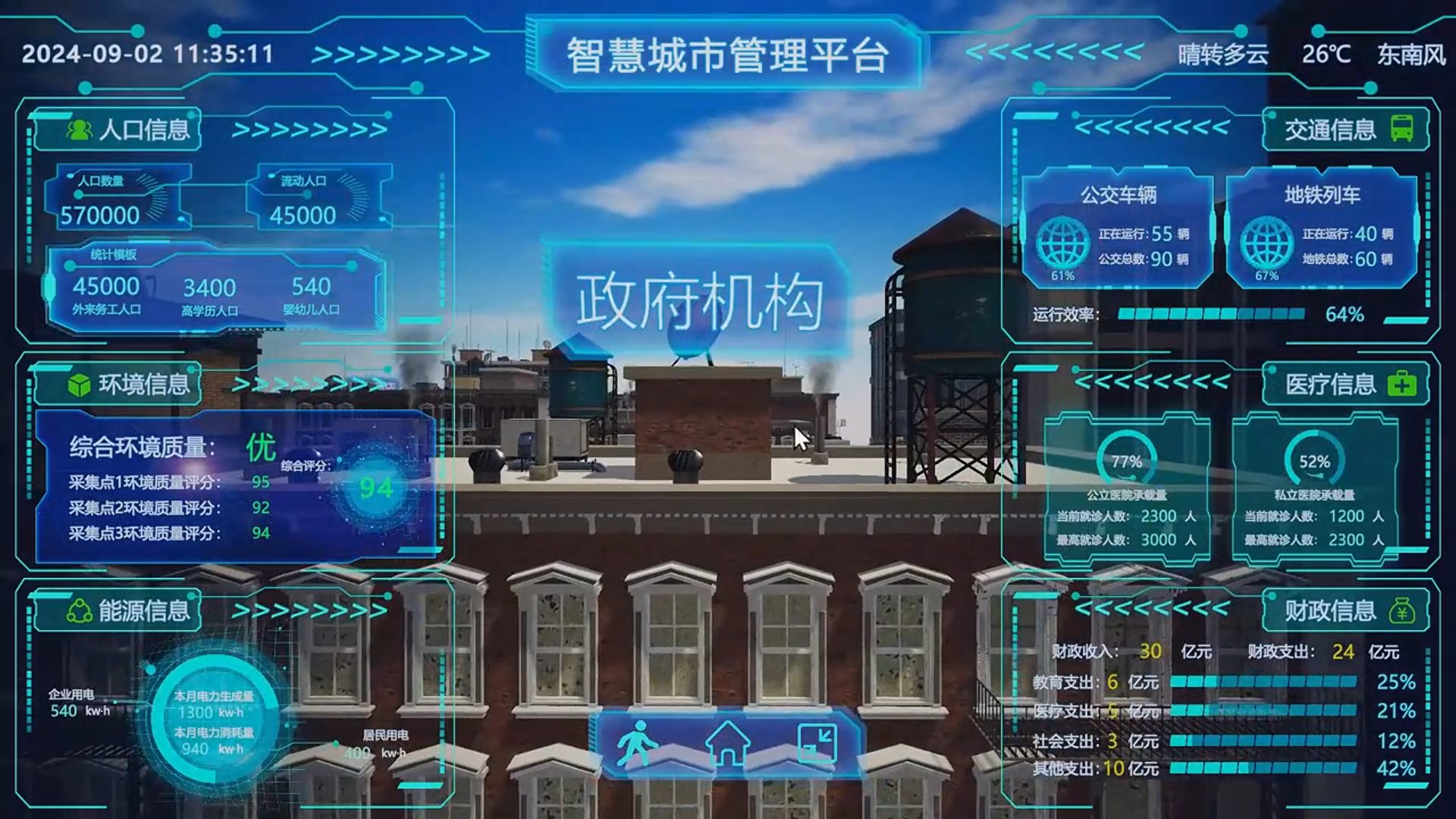 基于 Unity3D 引擎开发智慧城市数据可视化大屏,涵盖人口、环境、能源、交通、医疗和财政六大模块,通过 SQL Server 实现数据读写与实时更新,支持日期、时间、天气等信息展示,并提供第一人称漫游和 3D POI 交互功能。