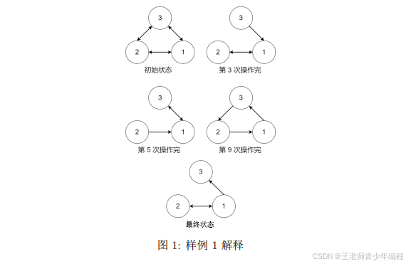 - 若 t = 1 t = 1 t=1,接下来两个整数 u , v u, v u,v 表示敌人摧毁了从据点 u u u 出发到据点 v v v 的虫洞。保证该虫洞存在且未被摧毁。