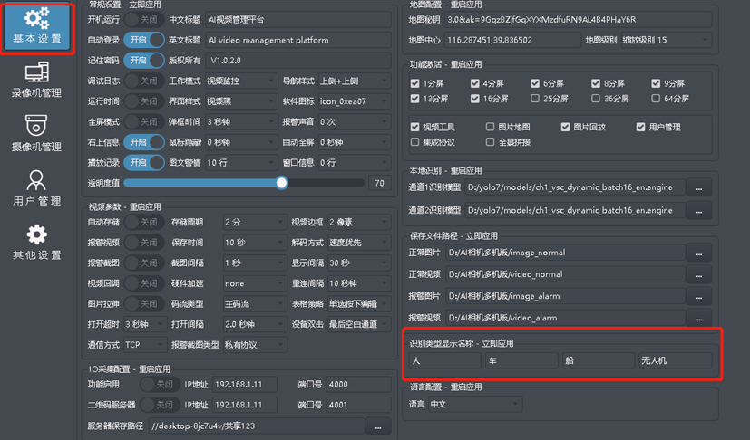 目标识别类别根据识别类型的不同,名字也会有相应的调整,如果模型类别名称与实际类别不一致时,可手动修改名称。名称修改在"系统设置"页面,"基本设置"子页面中。