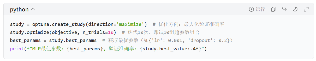 lr设为对数分布(log=True):深度学习中学习率的有效范围是对数级的(如 1e-4 比 0.01 更优的概率远高),对数采样能更均匀覆盖有效范围; - Dropout 率设为均匀分布:0.1~0.5 的范围是 MLP 的常规有效范围,均匀采样即可。