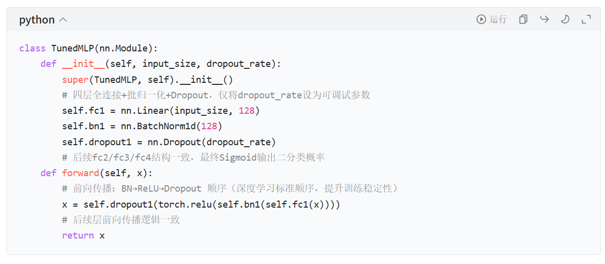 dropout_rate)作为模型初始化参数,非调参参数(如隐藏层维度 128/64/32)固定,简化调优空间; - 关键细节: