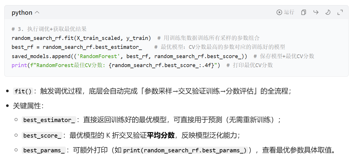 n_iter)的参数组合,而非遍历所有组合(这是和网格搜索的核心区别); - 交叉验证评估 :对每一组随机采样的参数,用K 折交叉验证(CV) 训练模型并计算验证分数,最终选择验证分数最高的参数组合作为最佳超参数,对应的模型为最佳估计器(best_estimator_)。
