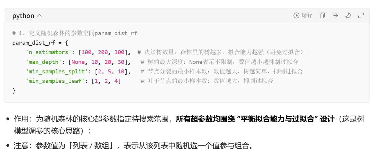 - 定义参数空间 :为模型每个超参数指定一个待搜索的取值范围 / 列表(如随机森林的