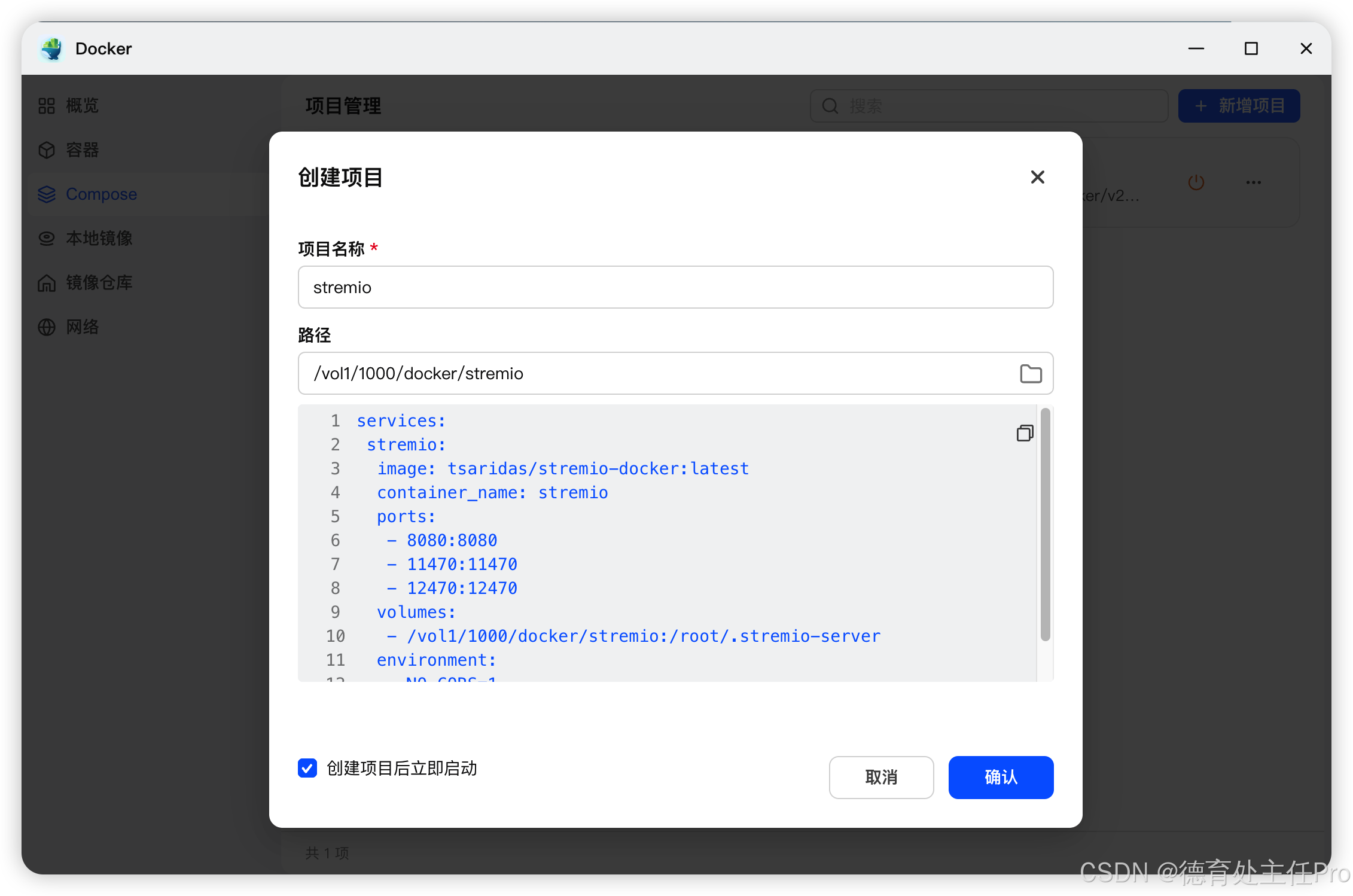 - 路径:选择刚刚在 docker 目录下创建的 stremio 文件夹。