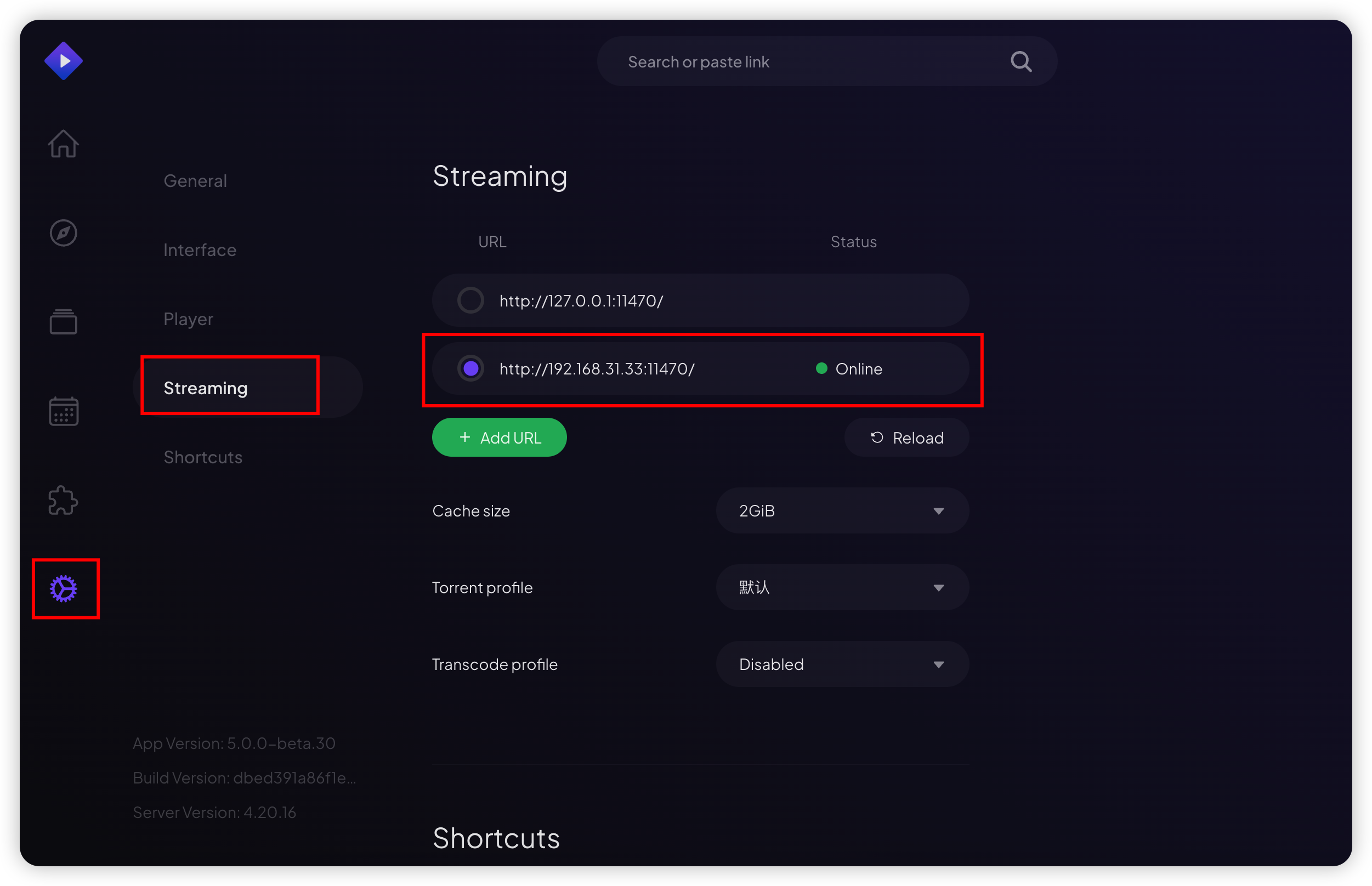 在设置页面,进入"Streaming",新增一项 你NAS的IP:11470。