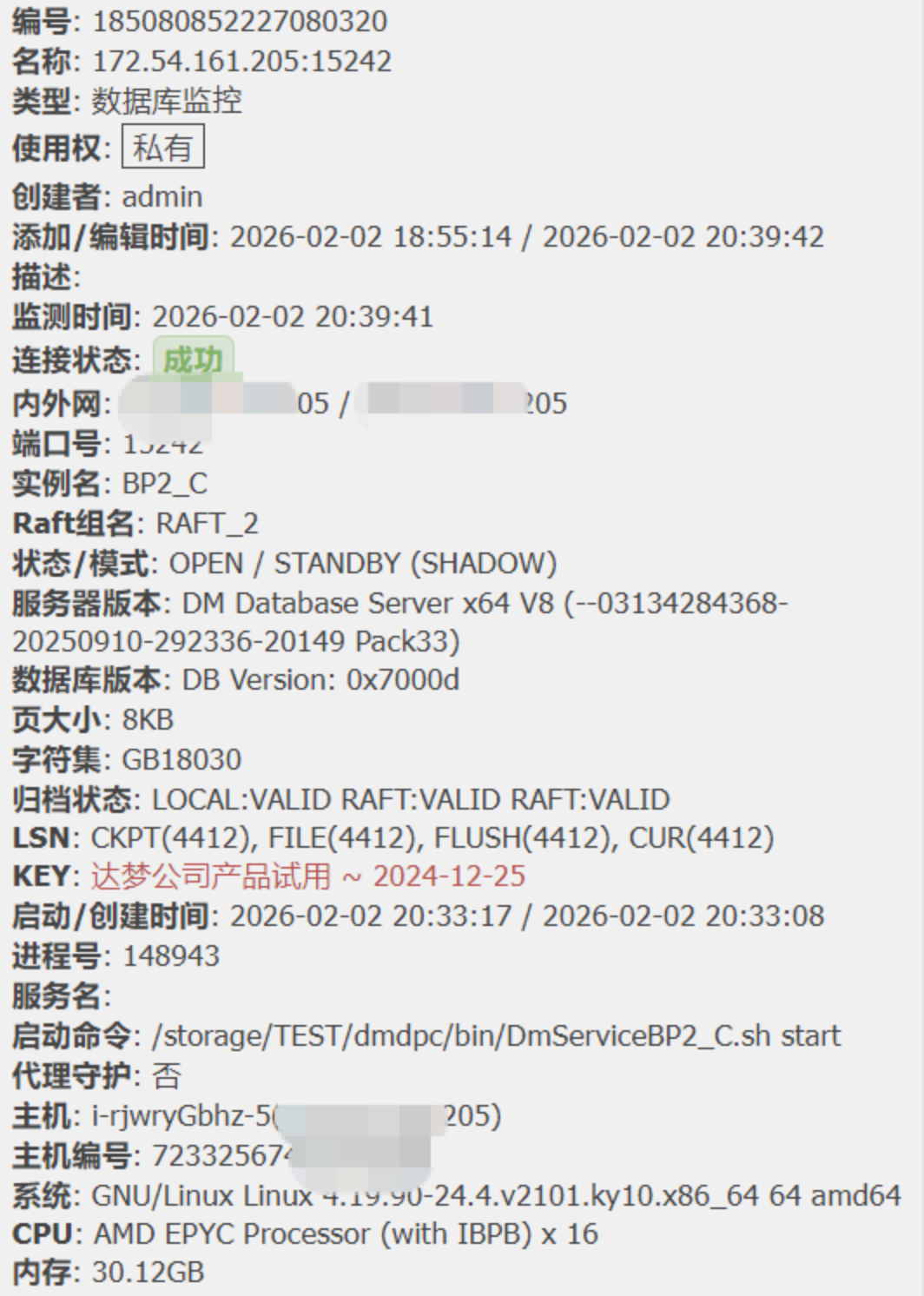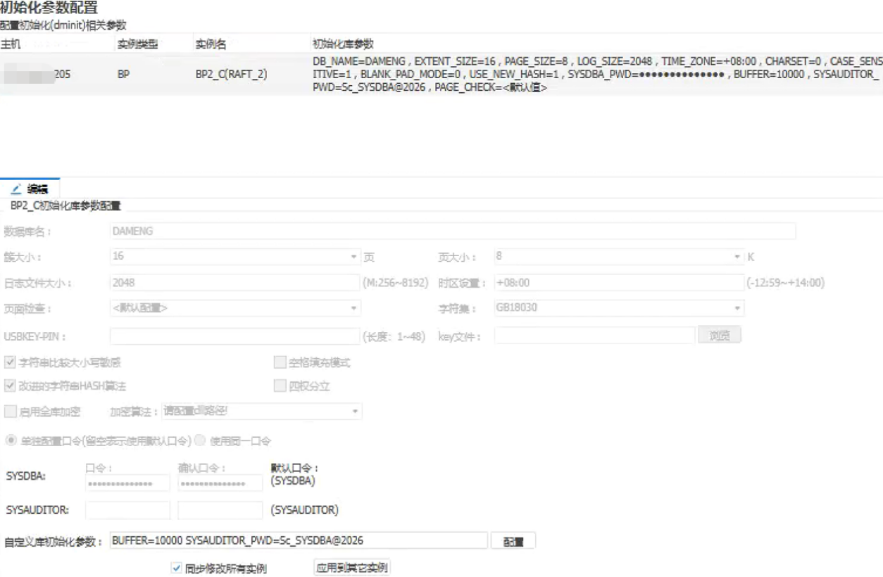 执行初始化命令[/storage/TEST/dmdpc/bin/dminit PATH=/storage/TEST/dmdpc/BP2_C PORT_NUM=15242 DB_NAME=DAMENG EXTENT_SIZE=16 PAGE_SIZE=8 LOG_SIZE=2048 TIME_ZONE=+08:00 CHARSET=0 CASE_SENSITIVE=1 BLANK_PAD_MODE=0 USE_NEW_HASH=1 SYSDBA_PWD=Sc_SYSDBA@2025 SYSAUDITOR_PWD=Sc_SYSDBA@2026 BUFFER=10000 AUTO_OVERWRITE=1 AP_PORT_NUM=11642 DPC_MODE=2]