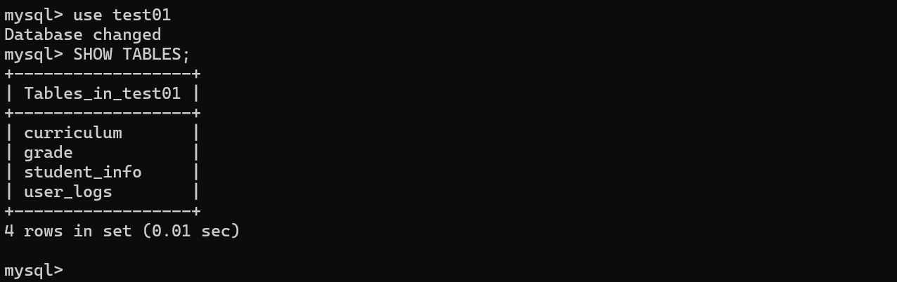 例如,我们可以切换到 test01 这个系统数据库,并查看系统数据库中的所有表结构。