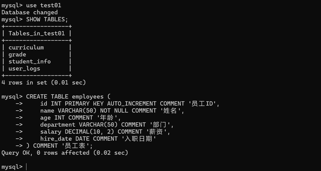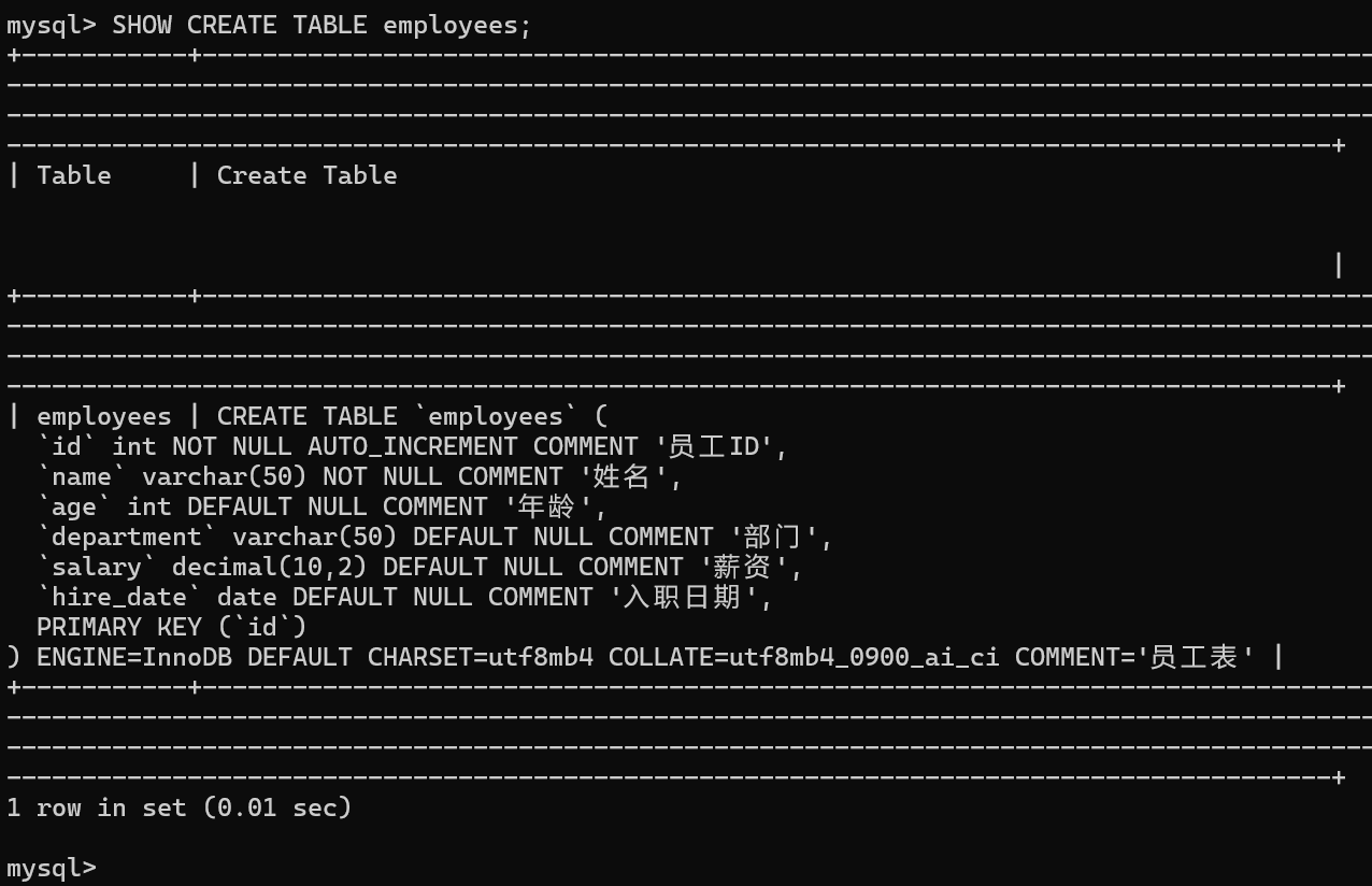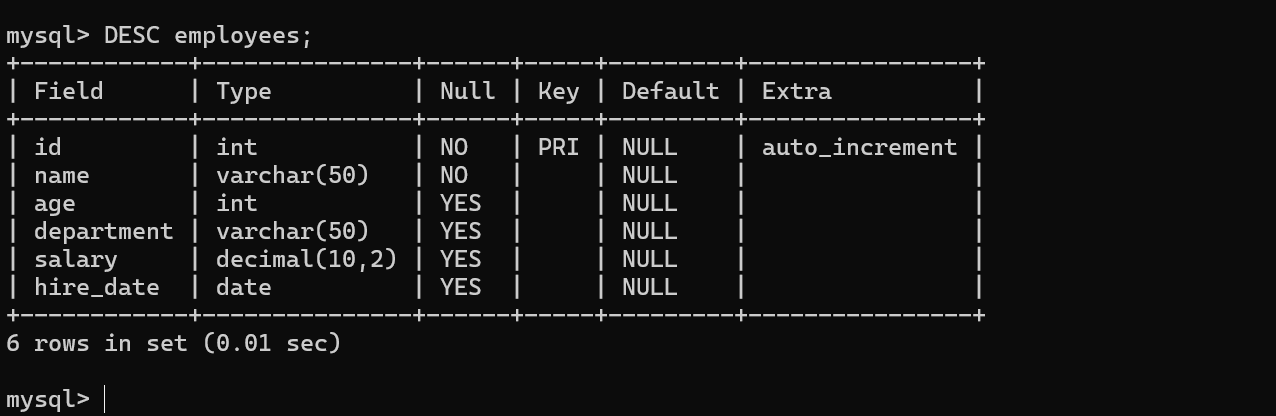 id:主键,自动递增name:姓名,非空字段age:年龄department:部门salary:薪资,精确到小数点后2位hire_date:入职日期