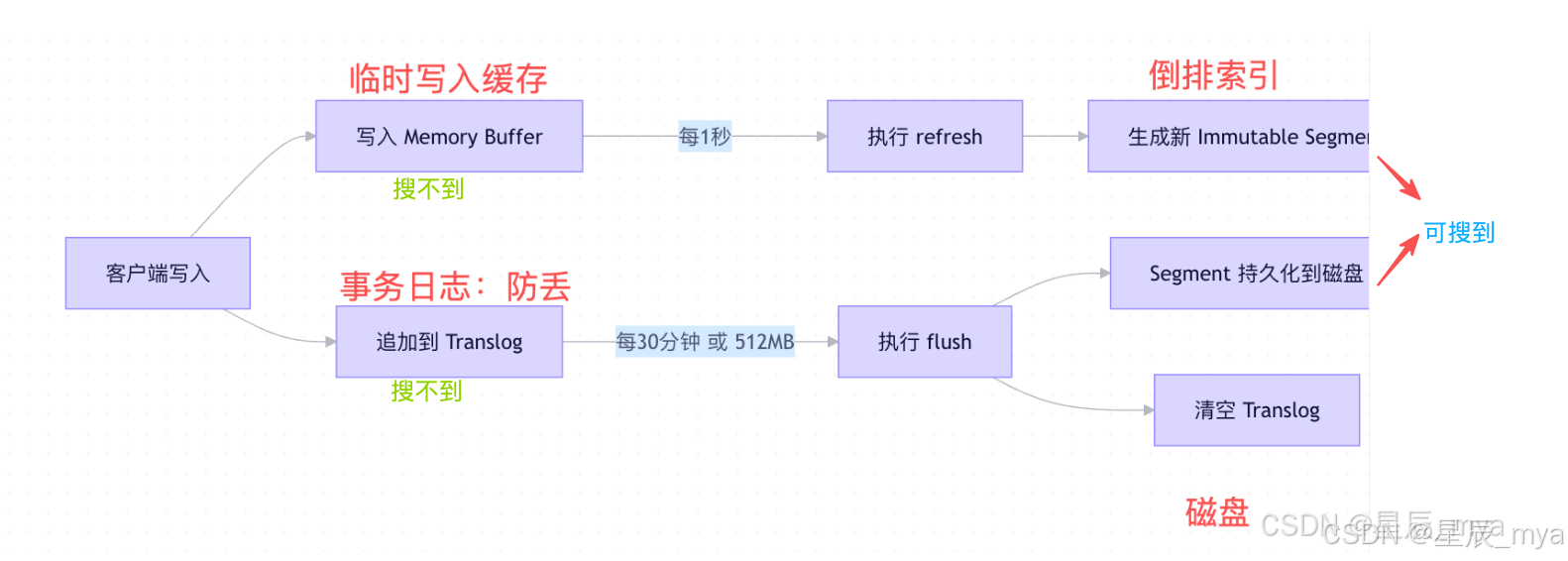 - 每 30 分钟 或 Translog 满,触发 flush → 写入磁盘 + 清空 Translog