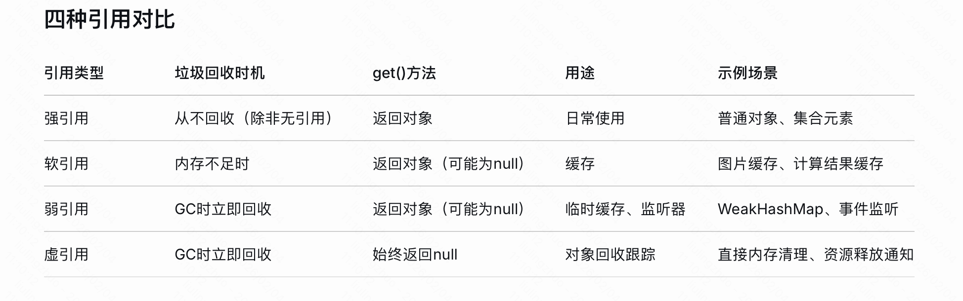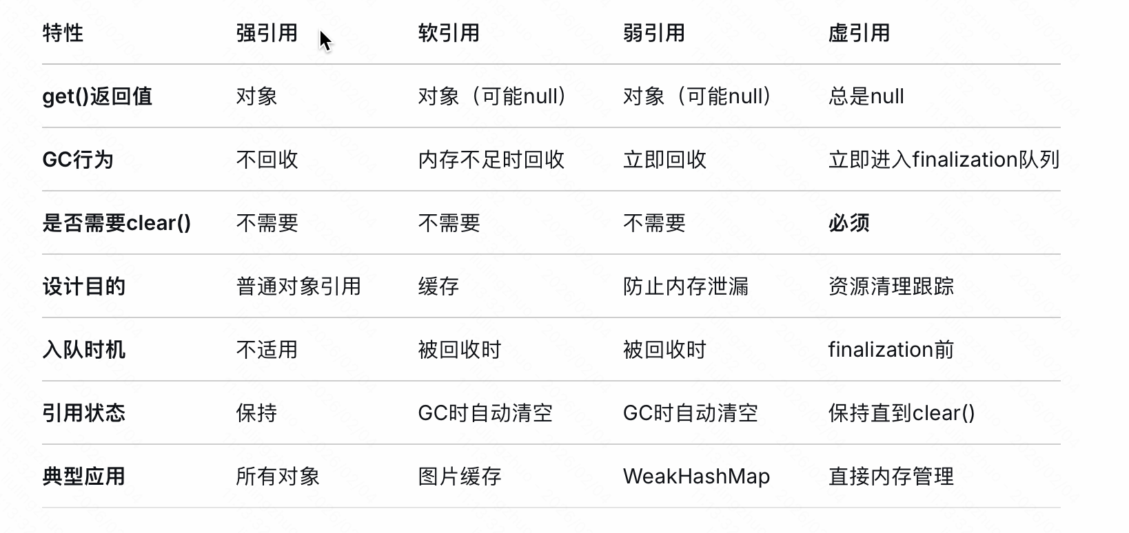- 虚引用必须调用clear() - 否则对象无法被完全回收。软引用和弱引用在GC时会自动调用clear(),所以程序员不需要显式调用,虚引用在GC时不会自动clear(),必须手动调用以完成对象回收(其实就是将引用置为null,解除和被引用对象的关系,使其可以被回收)