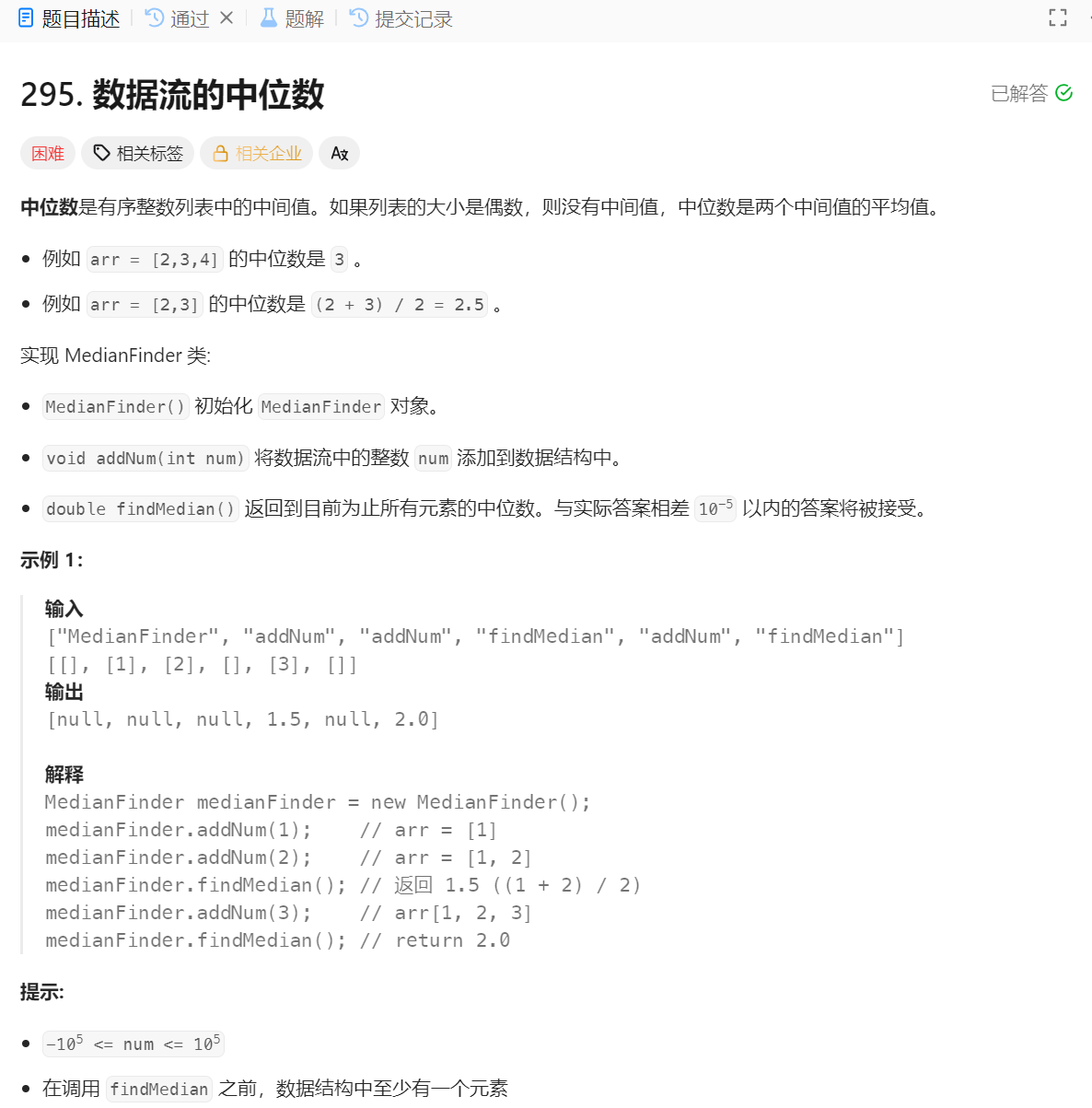 第一反应是创建一个数组,然后将所有元素放进去,要找中位数的时候,再进行一次排序,最后返回数组长度一半的那个数即可,但是会超时,其中排序的时间复杂度为O(NlogN)