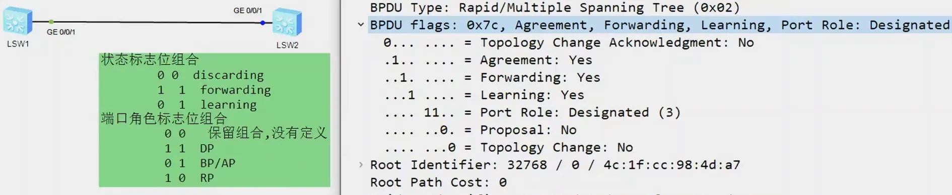 - 交换机收到后通过这个BPDU判断自己是RP,会阻塞除边缘端口外的其他端口。然后直接将RP端口状态直接变成Forwarding,然后发送A置1的BPDU给对方。如果判断自己是AP则直接继续阻塞。