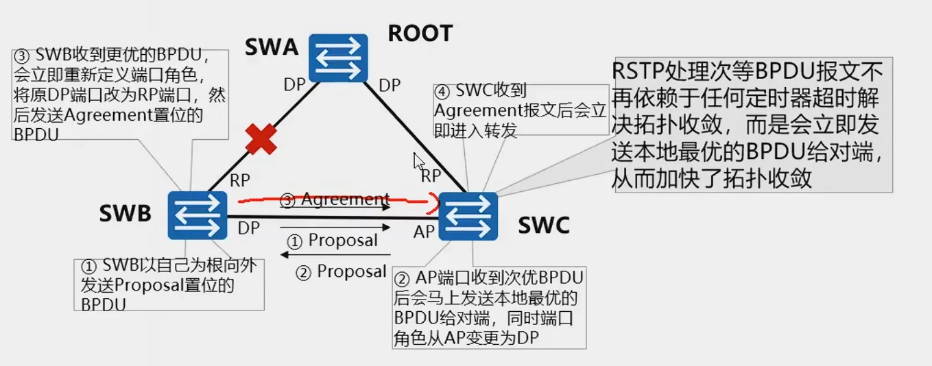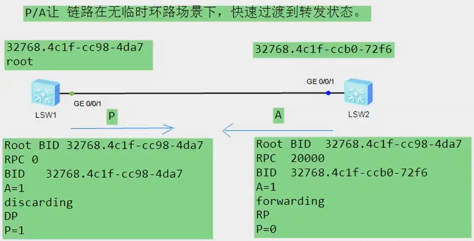 - 目的:让链路在没有临时环路的情况下,快速进入到转发状态,不用再等待计时器超时,提高RSTP协议的收敛速度