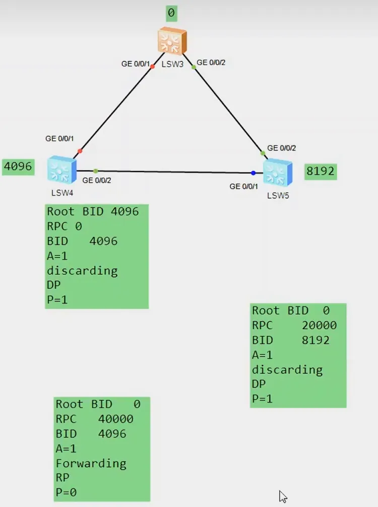 - 当两台交换机连接新链路时,双发都会认为自己的接口是DP,都处于Discarding状态互相发送P置1的BPDU希望和对方做P/A协商。互相交换后选举出DP和RP。