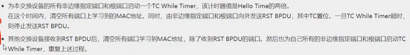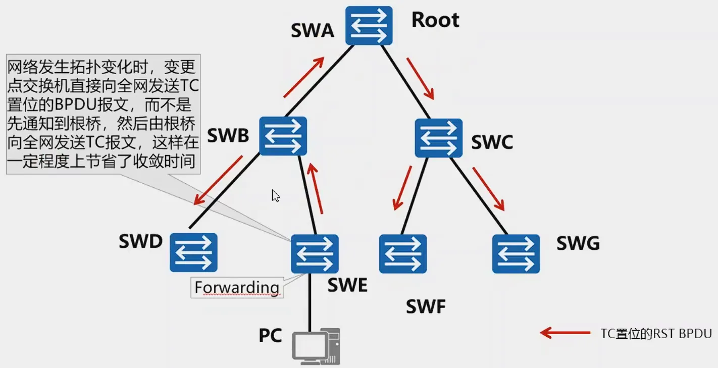 - 发送方会马上清空发送变化的端口上学习到的MAC地址。4秒后TC While Timer超时,则停止发送RST PBDU