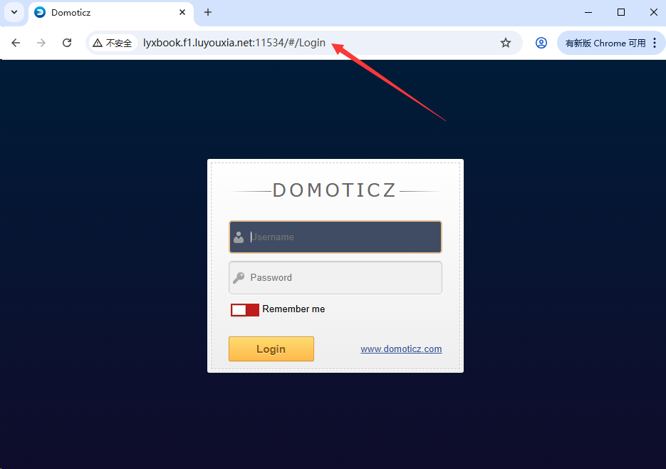 12,在外网电脑上,打开浏览器,在地址栏输入从路由侠生成的外网地址,就可以看到内网部署的 Domoticz 登录界面了。