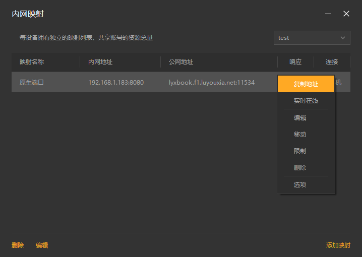 11,创建好后,就可以看到一条映射的公网地址,鼠标右键点击【复制地址】。