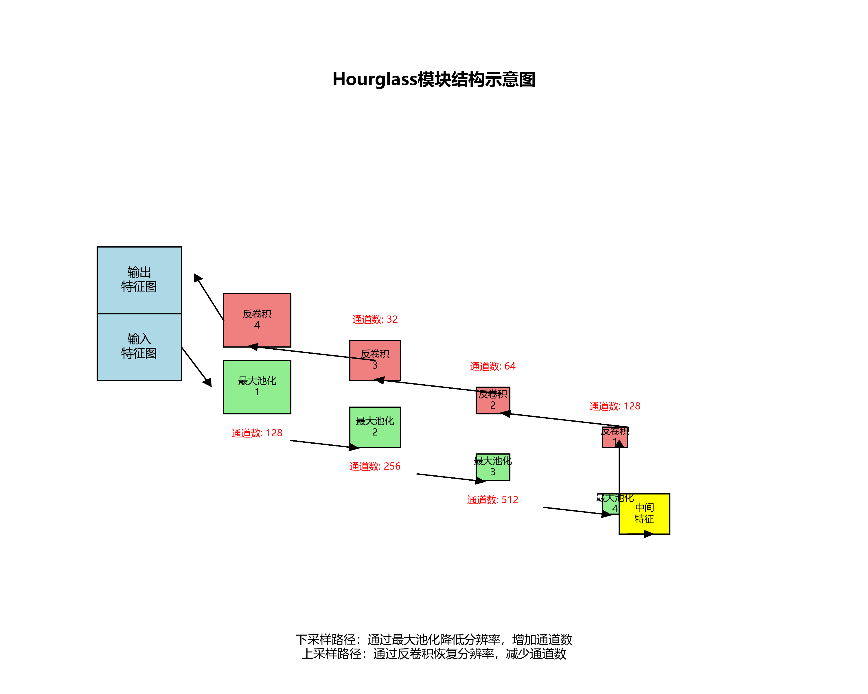 每个hourglass模块包含下采样路径和上采样路径,形成对称结构。下采样路径通过最大池化操作逐步降低特征图的空间分辨率,同时增加通道数;上采样路径则通过反卷积操作逐步恢复特征图的空间分辨率,同时减少通道数。这种设计使得网络能够同时捕获全局和局部特征信息。