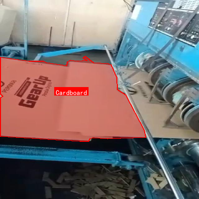 图片展示了工业纸板加工场景中纸板检测与识别的关键环节。画面中心是一块红色纸板,其上印有"Gearlip"品牌标识及文字,被红色边框标注为"Cardboard",表明这是待检测的纸板对象。背景可见蓝色工业设备,包含滚轮、金属支架等机械结构,推测是用于纸板传输或加工的生产线装置;下方散落着切割后的纸板碎屑,显示该环节处于纸板加工流程的中后段。从任务目标看,此场景聚焦于纸板在加工过程中需进行的检测与识别------通过视觉标记(如红色边框)、品牌标识等特征,结合工业设备的传输功能,实现对纸板的定位、类型确认或质量筛查,是工业自动化生产中保障纸板加工精度与效率的重要步骤。