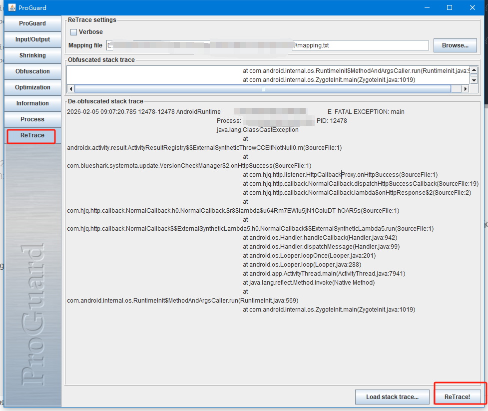 选择retrace,browse选择项目mapping.txt(位置于build/release/mapping.txt),后进行retrace即可