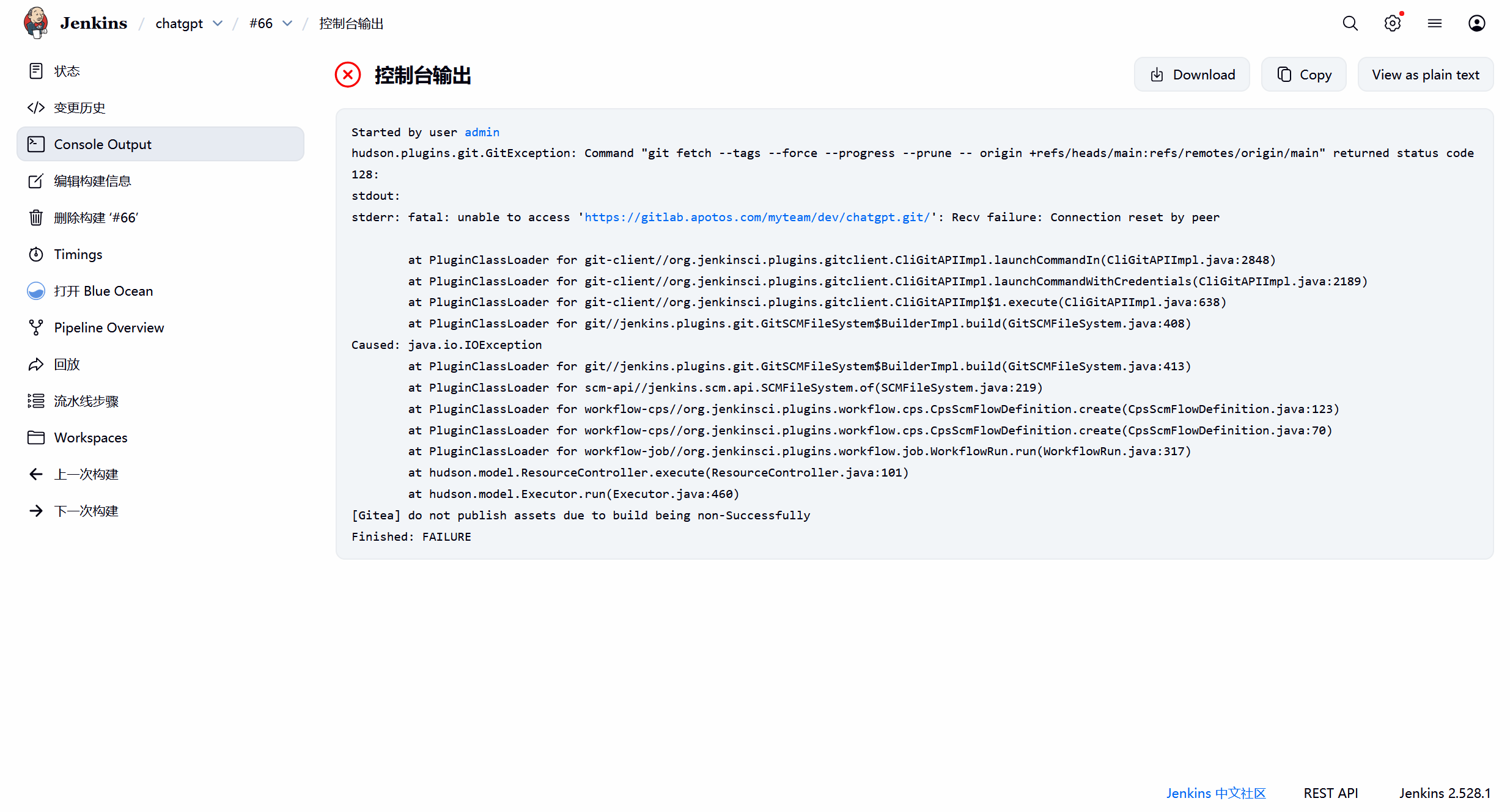 stderr: fatal: unable to access 'https://gitlab.apotos.com/myteam/dev/chatgpt.git/': Recv failure: Connection reset by peer