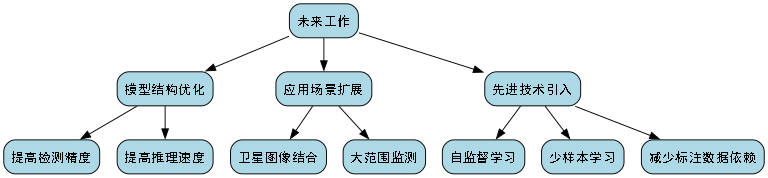 未来工作可以从以下几个方面展开:一是进一步优化模型结构,提高检测精度和推理速度;二是扩展应用场景,如结合卫星图像进行大范围监测;三是引入更多先进技术,如自监督学习、少样本学习等,减少对标注数据的依赖。