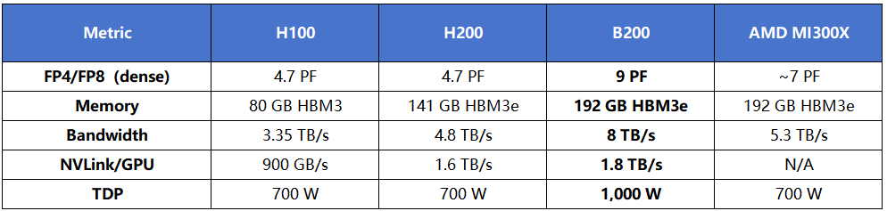 对于 70B 以上 的密集模型或 MoE 架构,B200 可以在更少 GPU 数量下完成模型驻留,降低通信复杂度,并缩短训练和微调周期。