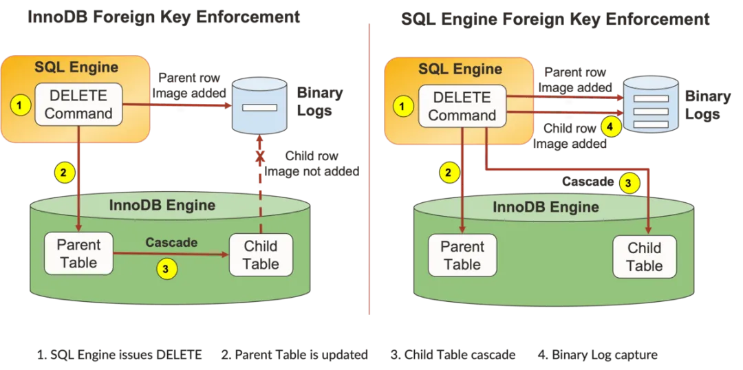 为了解决这些问题,MySQL 现在强制执行外键,并在 SQL 引擎内部管理级联操作。通过这项更改,父表和子表上的所有外键操作对 SQL 层都是完全可见的。