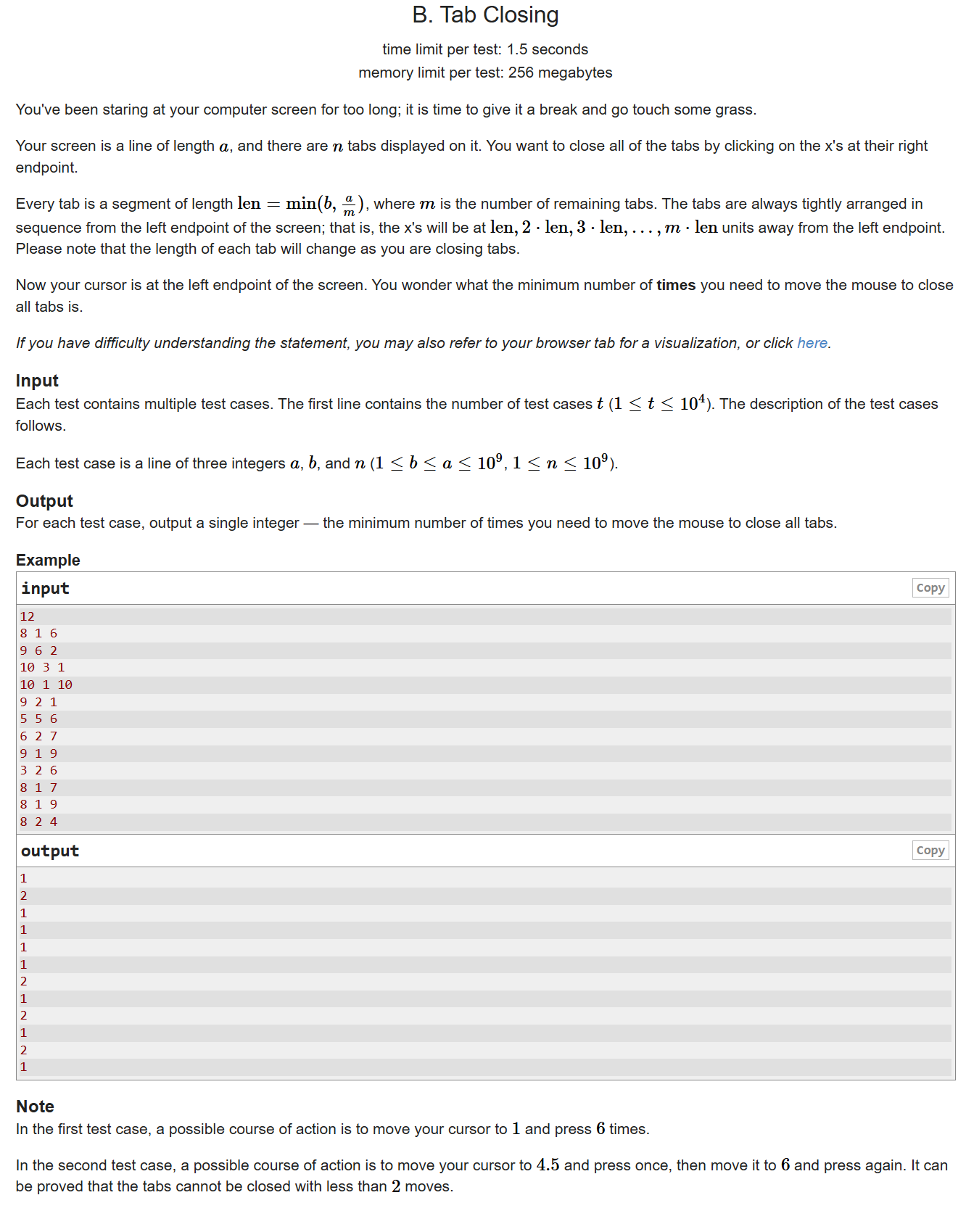 简单解释一下题意,就是有 个标签页,然后你可以让你的鼠标移动到任意固定位置,看需要多少次能把标签页都关闭(关闭的时候只能点击每个标签页最右边的