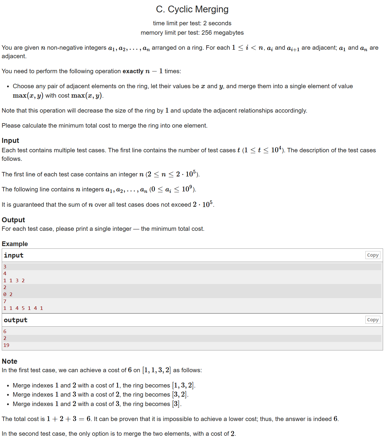 由于小的值和大的值合并之后,就合并为较大的那个值,所以之后无论任何策略,想和最小值合并,就要先合并到最小值的邻居位置,这样的话就会导致最小值的邻居位置值不会比最开始的较小邻居值小,且小的值无论如何都要被合并,不会对未来的最优解有影响。