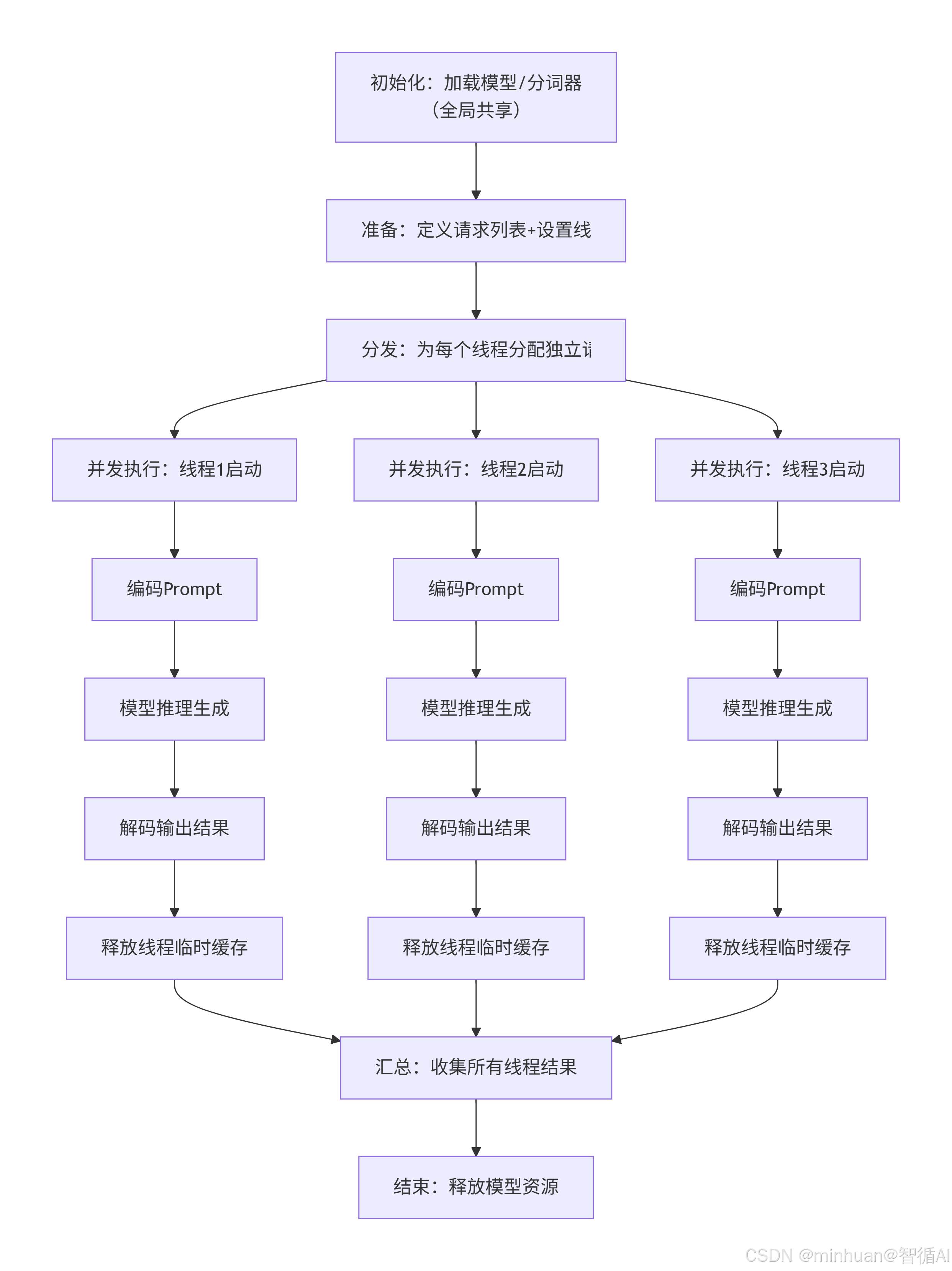 - 线程安全保障:model.eval()切换为推理模式,禁用训练相关的随机层(如 Dropout),同时transformers库的generate()方法已做线程安全优化,多个线程同时调用不会篡改模型参数。