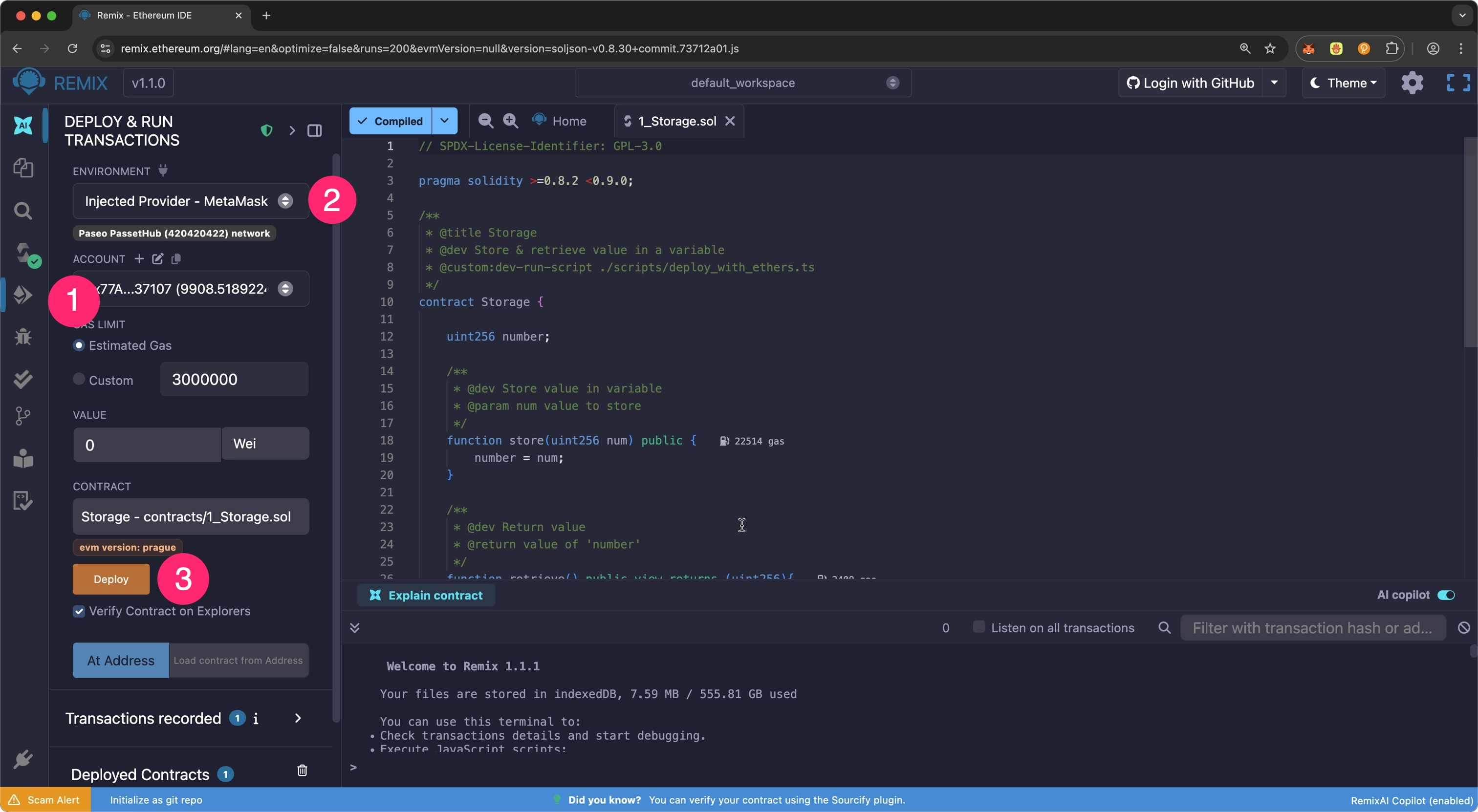 这篇教程将演示如何使用 Remix IDE(浏览器里的可视化开发环境)将一个最基础的 Solidity 智能合约部署到 Polkadot Hub 测试网。Remix 的特点是: