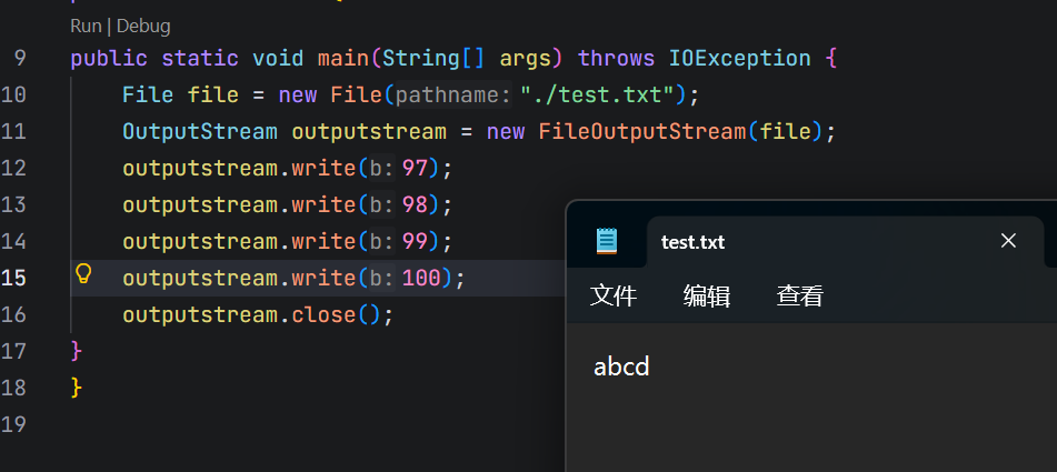 可以看到在write之后,文件里面多出来了abcd四个字母,这四个字母对应的ASCII码就是97,98,99,100
