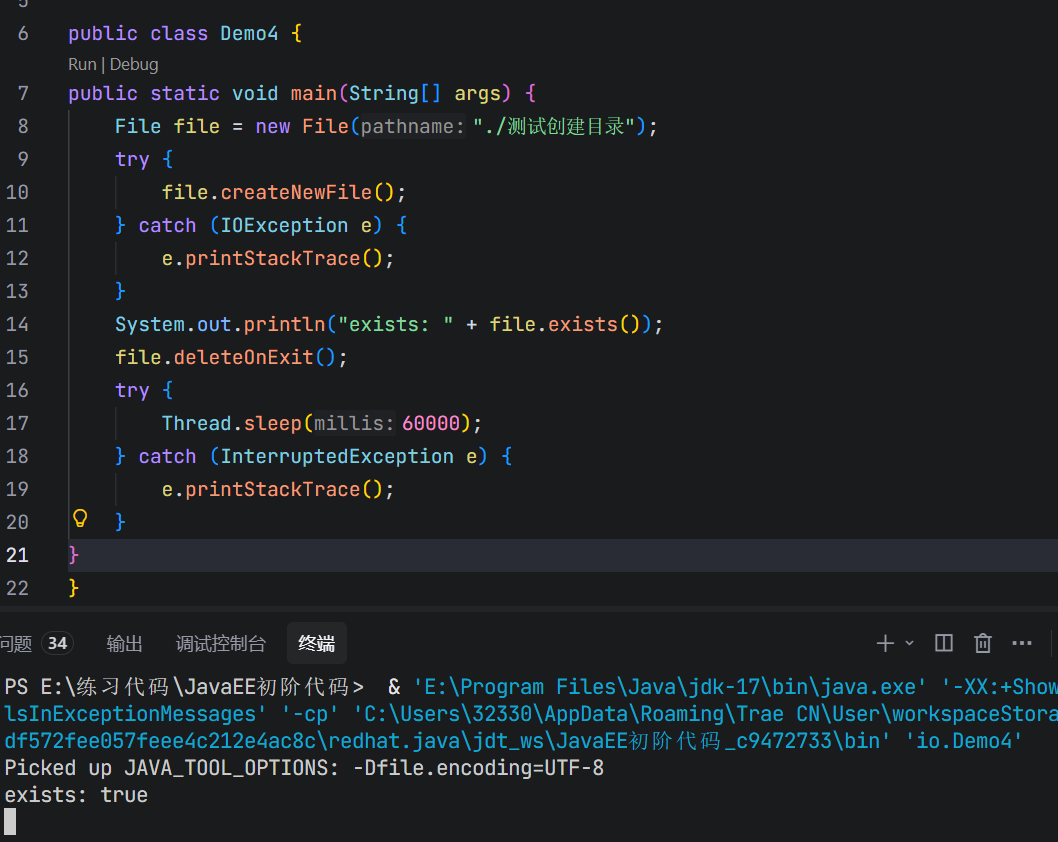 在执行程序之后的60秒内,即使执行到deleteOnExit这行代码,但是60内还没运行结束,只有运行结束之后才会真正删除文件