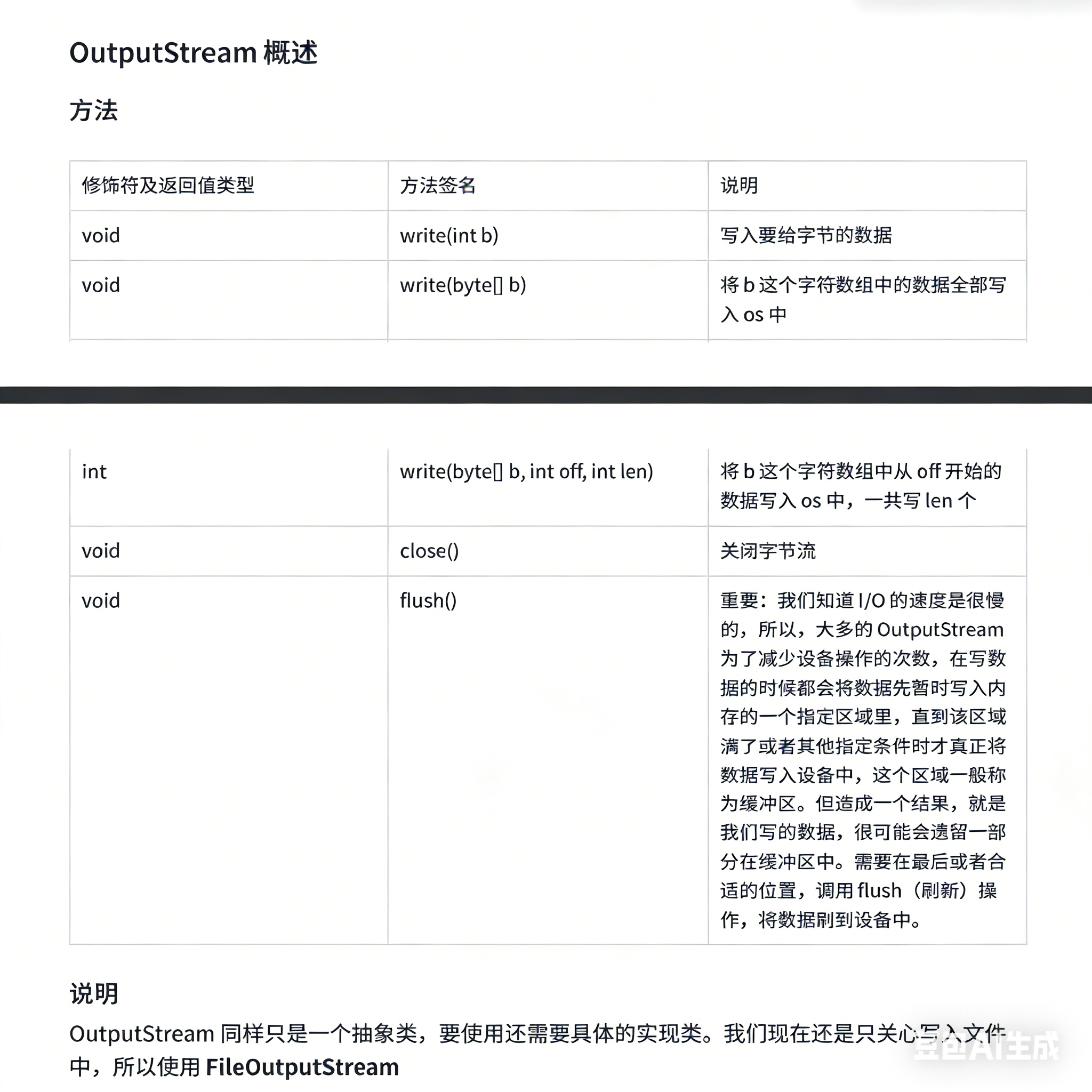 OutputStream和InputStream操作类似,都是一个抽象类,下面是OutputStram的各种方法