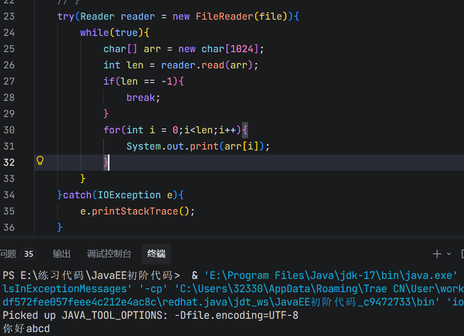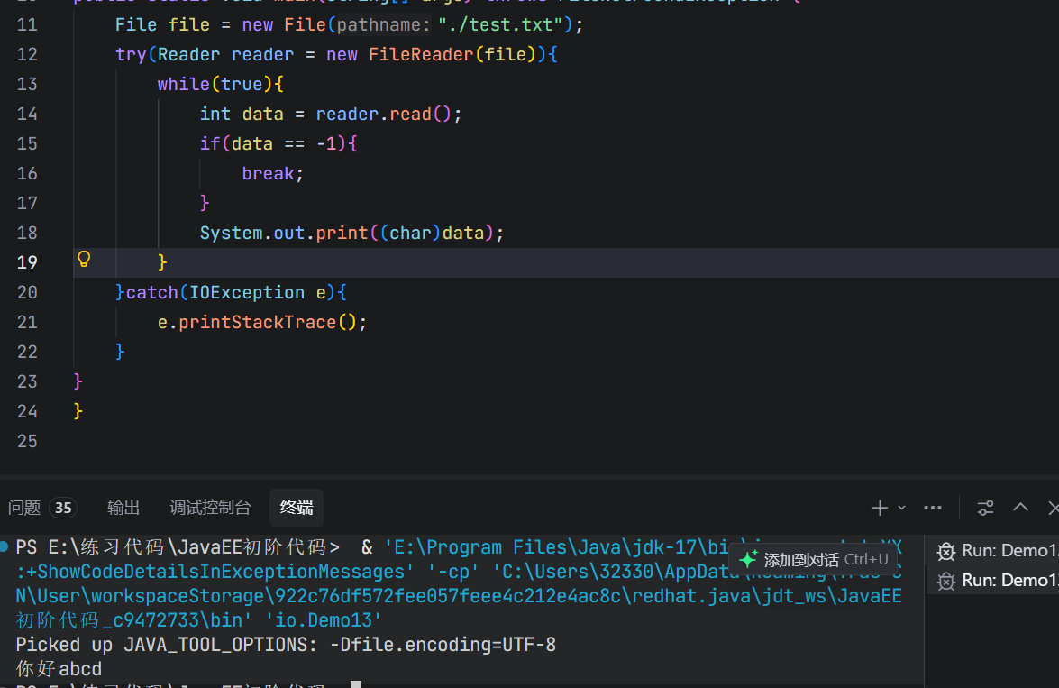 将test文件里面的内容改成"你好abcd",然后使用read()方式读取字符,并打印