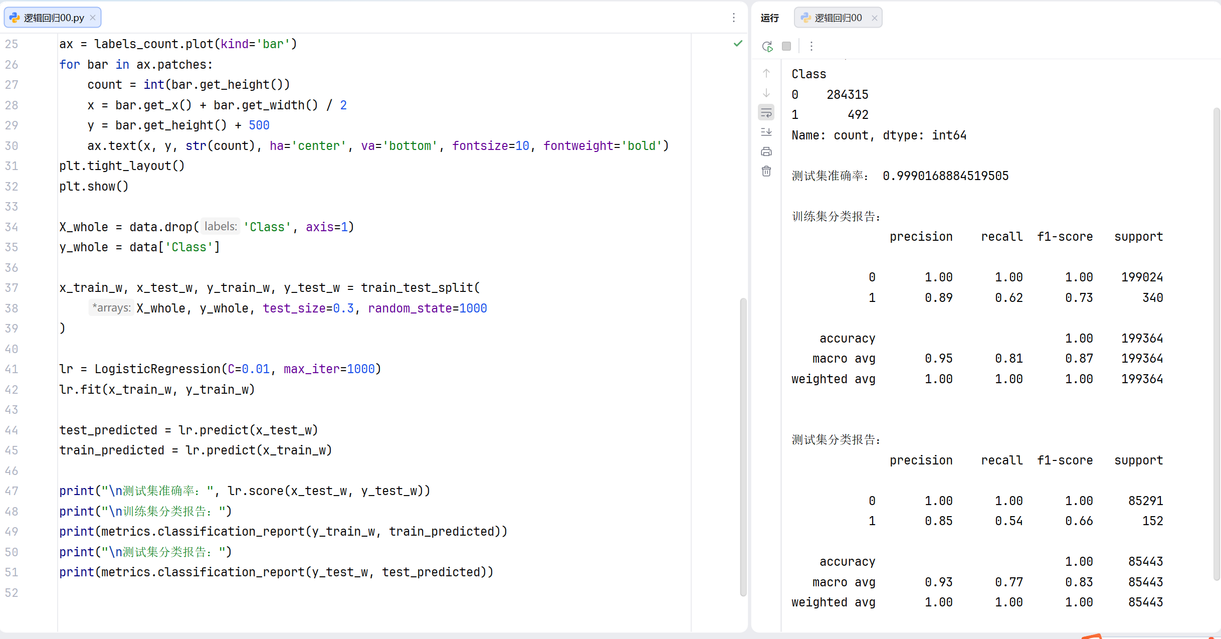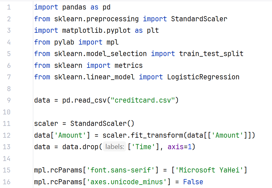 导入必要库和数据,然后对数据进行预处理,其中对Amount进行Z标准化,再将Time一列删除。然后再设置字体是微软雅黑