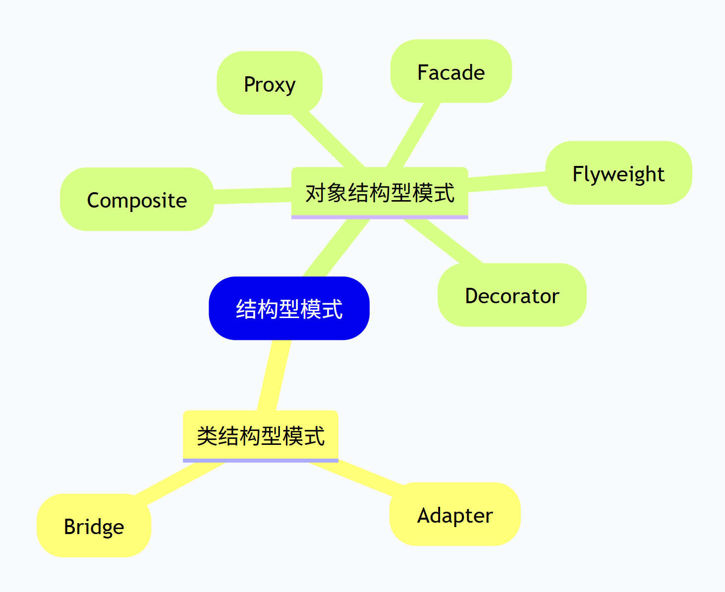 结构型模式包括七种模式:适配器模式(Adapter)、桥接模式(Bridge)、组合模式(Composite)、装饰器模式(Decorator)、外观模式(Facade)、享元模式(Flyweight)和代理模式(Proxy)。它们可以分为两类: