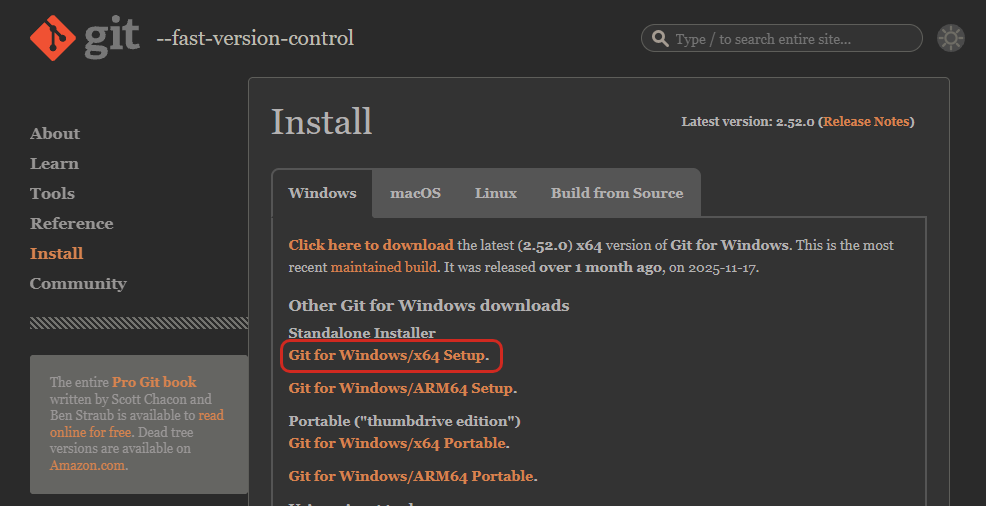 💡 建议 :始终下载最新稳定版。截至 2026 年初,Git for Windows 已发布 2.52.0 版本。Chromium 项目对 Git 版本有一定要求,旧版本可能缺少关键功能(如早期版本的长路径支持不完善)。