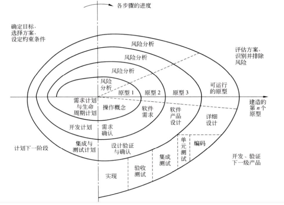 用户提出需求-->确定简单需求文档-->风险评估小组进行分析--->得到原型--->进行开发、测试--->得到小型的可运行模型--->用户测试并提出修改建议--->确定需求文档---> ...... --->得到一个可运行的原型--->概要设计-->详细设计-->编码-->测试-->运维