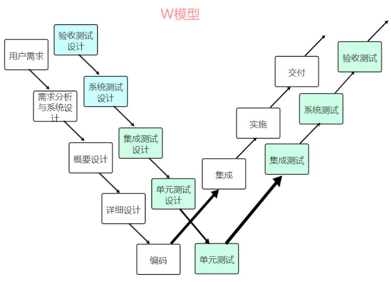 W模型是对V模型的扩展,强调开发与测试的并行性 :不仅每个开发阶段对应测试,且测试活动在开发早期即启动