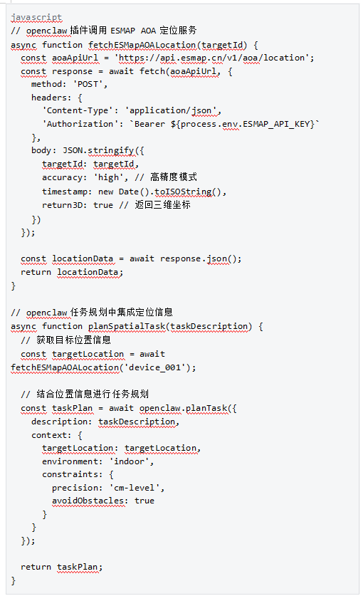 - API 层对接:openclaw 通过 RESTful API 调用 ESMAP AOA 定位服务,实现跨系统功能调用